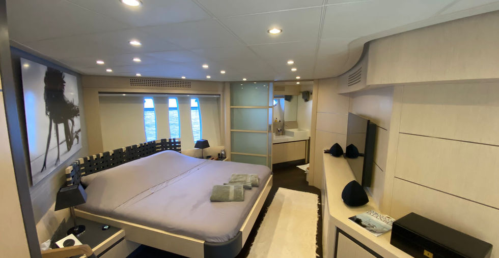 The semi-custom build has the spaciousness of a megayacht and is beautifully styled by designer Fulvio De Simoni with the highest attention to detail both inside and out. The sloping cabin and flying bridge give it an aggressive rake. Internally, however, peace is the theme, especially in how the choice of luxury materials and innovative space solutions display a harmony of design. In addition to a stern dining area with a sunbathing pod, there is a private bow dining area-something you don’t see every day-with a sunbathing platform, and sunbeds on the flying bridge. The lowering stern swim platform is spacious and comfortable.